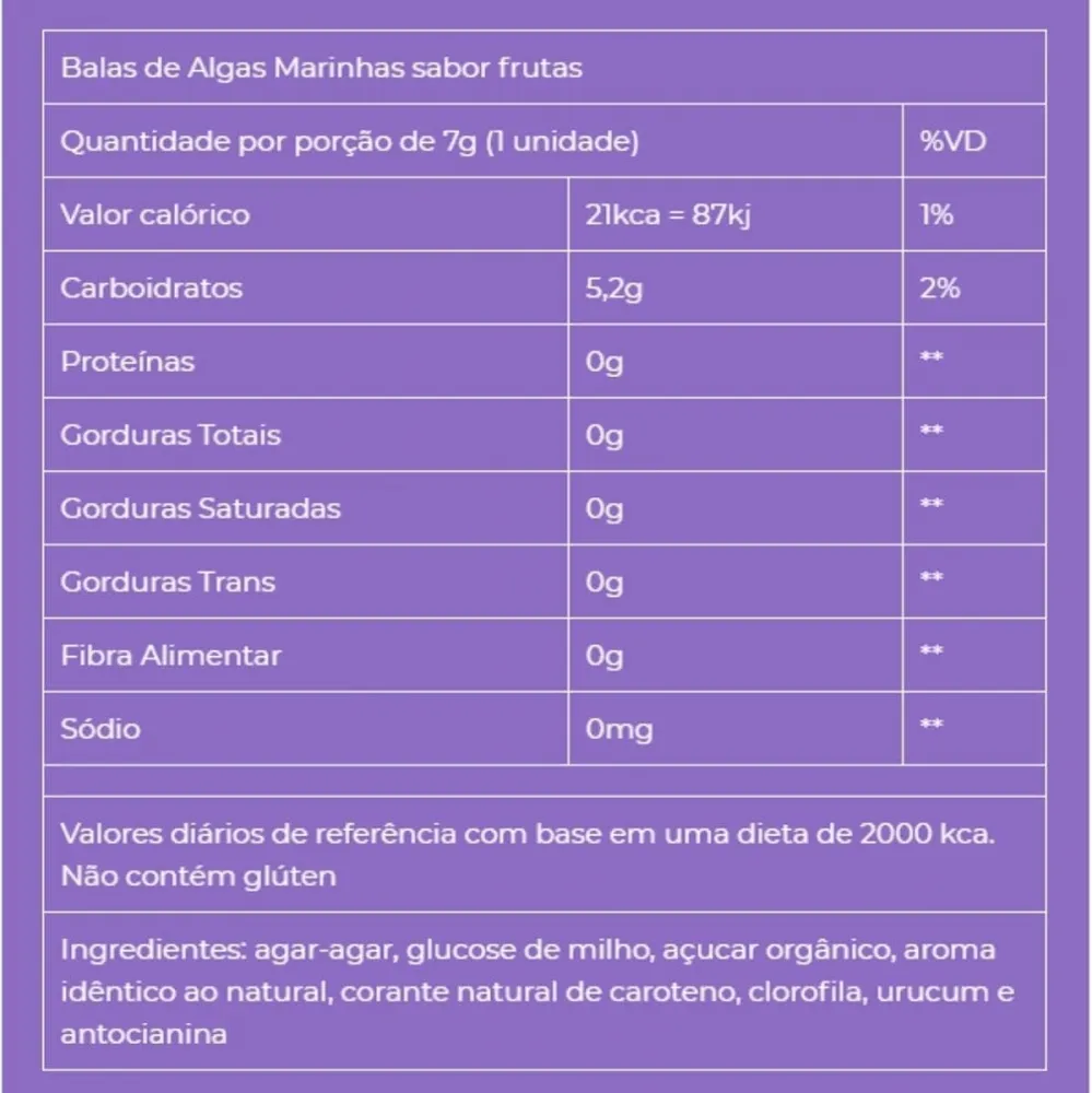 Com um sabor irresistível de morango, as balas de algas marinhas são deliciosas e naturais. Além de possuírem algar-algar, que é um extrato rico em sais minerais e fibras vegetais, contam com uma produção livre de glúten e selo de qualidade da Sweet. Sua composição natural conta com ingredientes específicos e ideais para você.